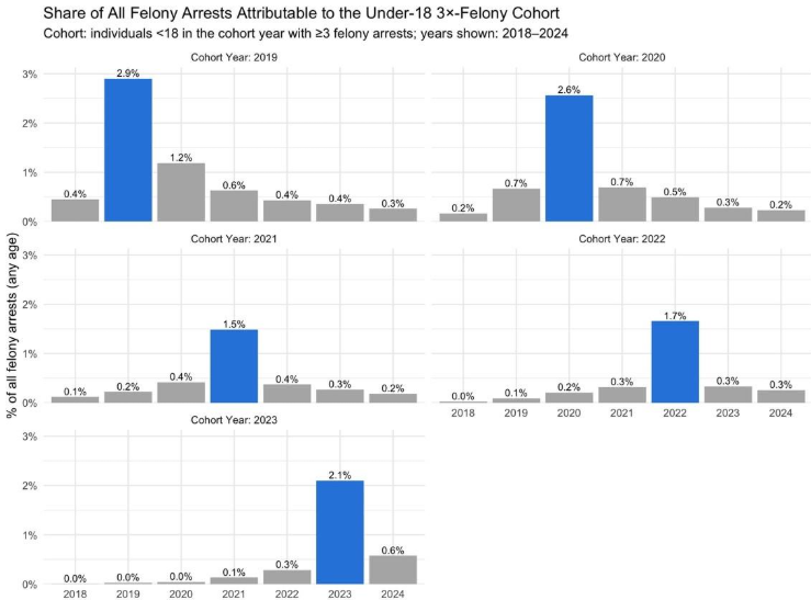 People who were under 18 with 3 or more felony arrests in 2021 were responsible for 1.5% of citywide felony arrests in 2021. Following the same group of people forward, the following year that group was responsible for 0.4% of citywide felony arrests, and 0.2% in 2024. Similar patterns are seen for other year cohorts.