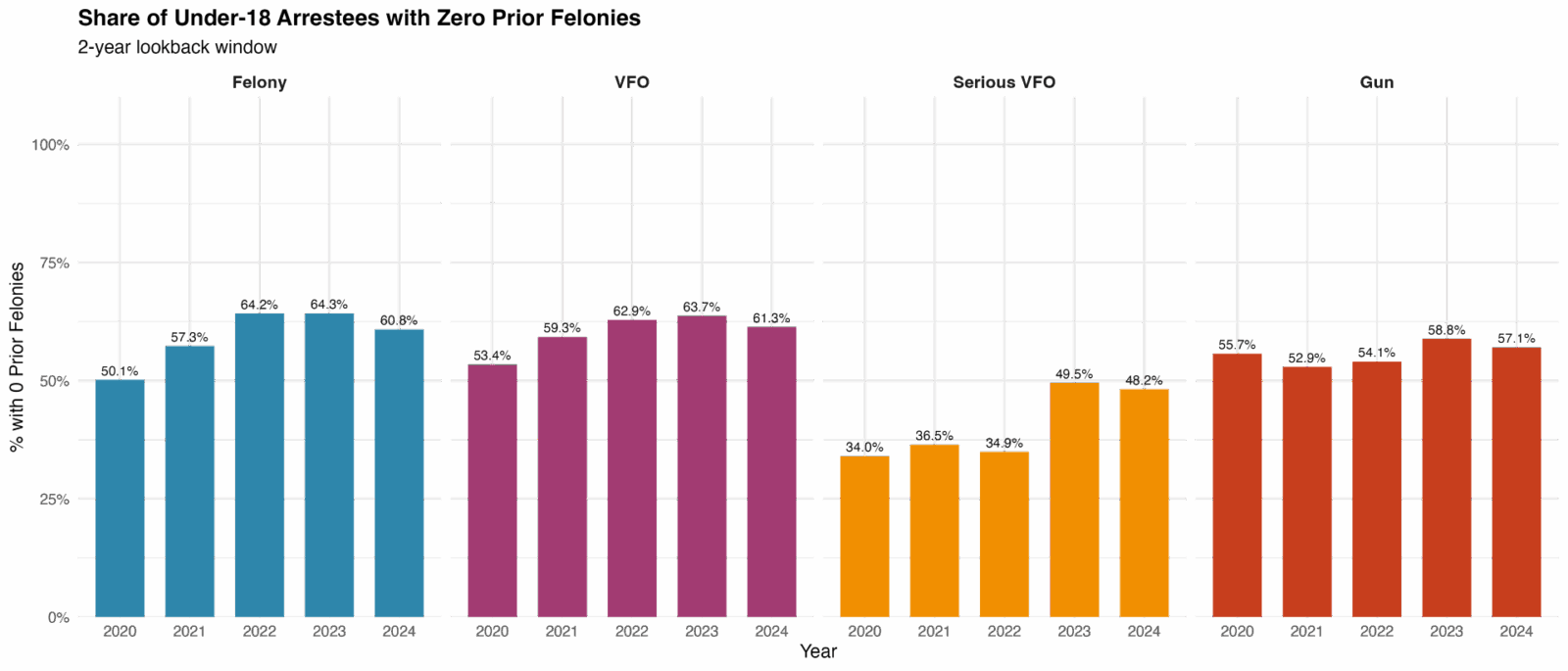 For VFOs, under-18 recidivism in 2024 was nearly unchanged from 2018 (31.9% vs. 30.8%). Within youth cohorts, 16–17-year-olds declined modestly, 18–19-year-olds held flat, and 13–15-year-olds rose slightly. In the narrower Serious VFO group, youth recidivism spiked before and during the pandemic but returned to its baseline by 2024 (25.4% vs. 25.0% in 2018). These data show that while overall youth felony recidivism stabilized, serious violent reoffending remains contained and has not increased compared to 2018.